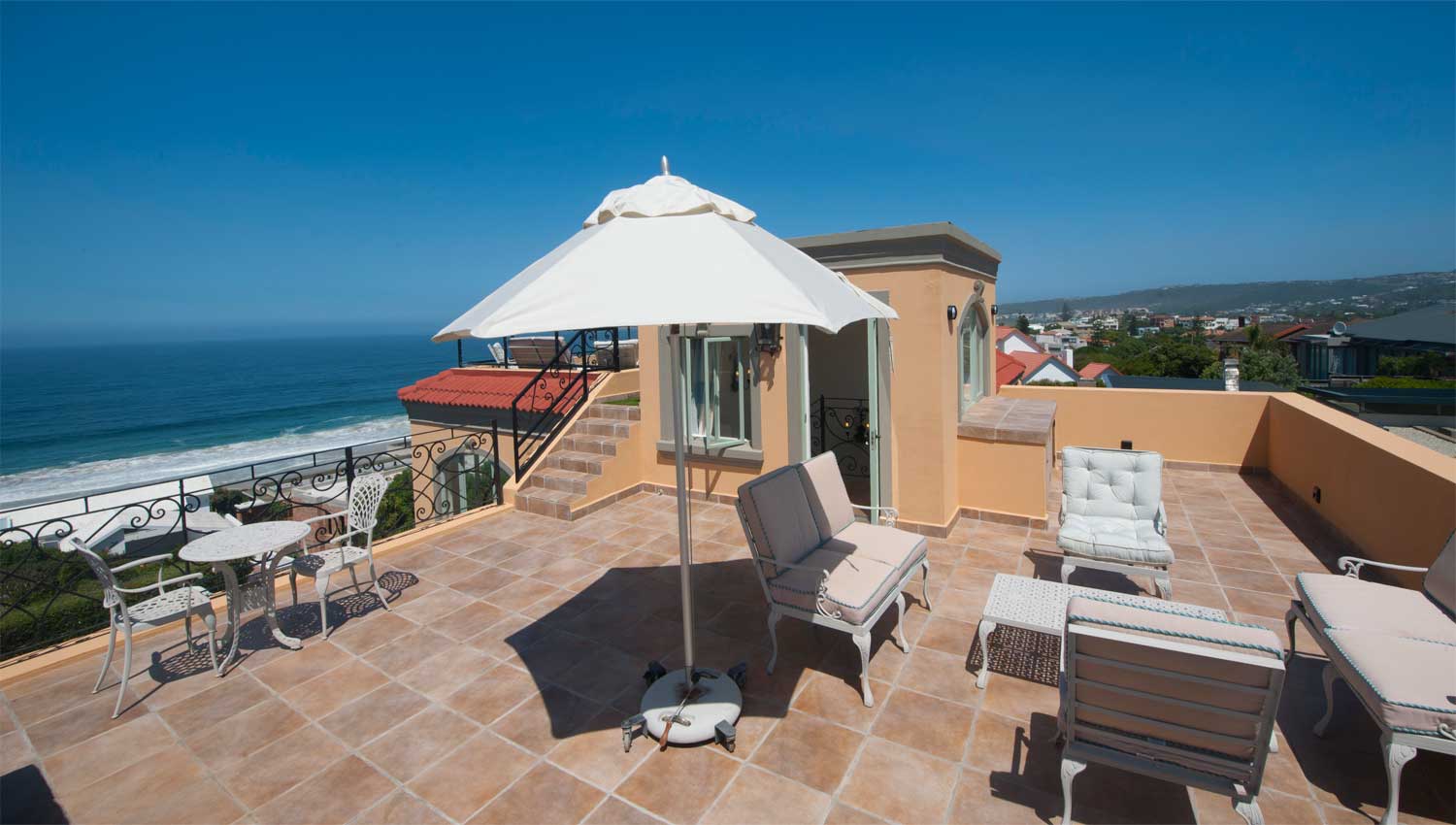 This beautiful four star graded holiday home is located on Plettenberg Bay’s most exclusive road. The three storey Mediterranean villa is situated on the highest point of Beachy Head Drive. The house is cool and airy with beautifully appointed, fully equipped interiors and an outdoor Jacuzzi. It has 6 bedrooms & 6 bathrooms, plus a separate en suite garden cottage and sleeps a total of 15 guests.