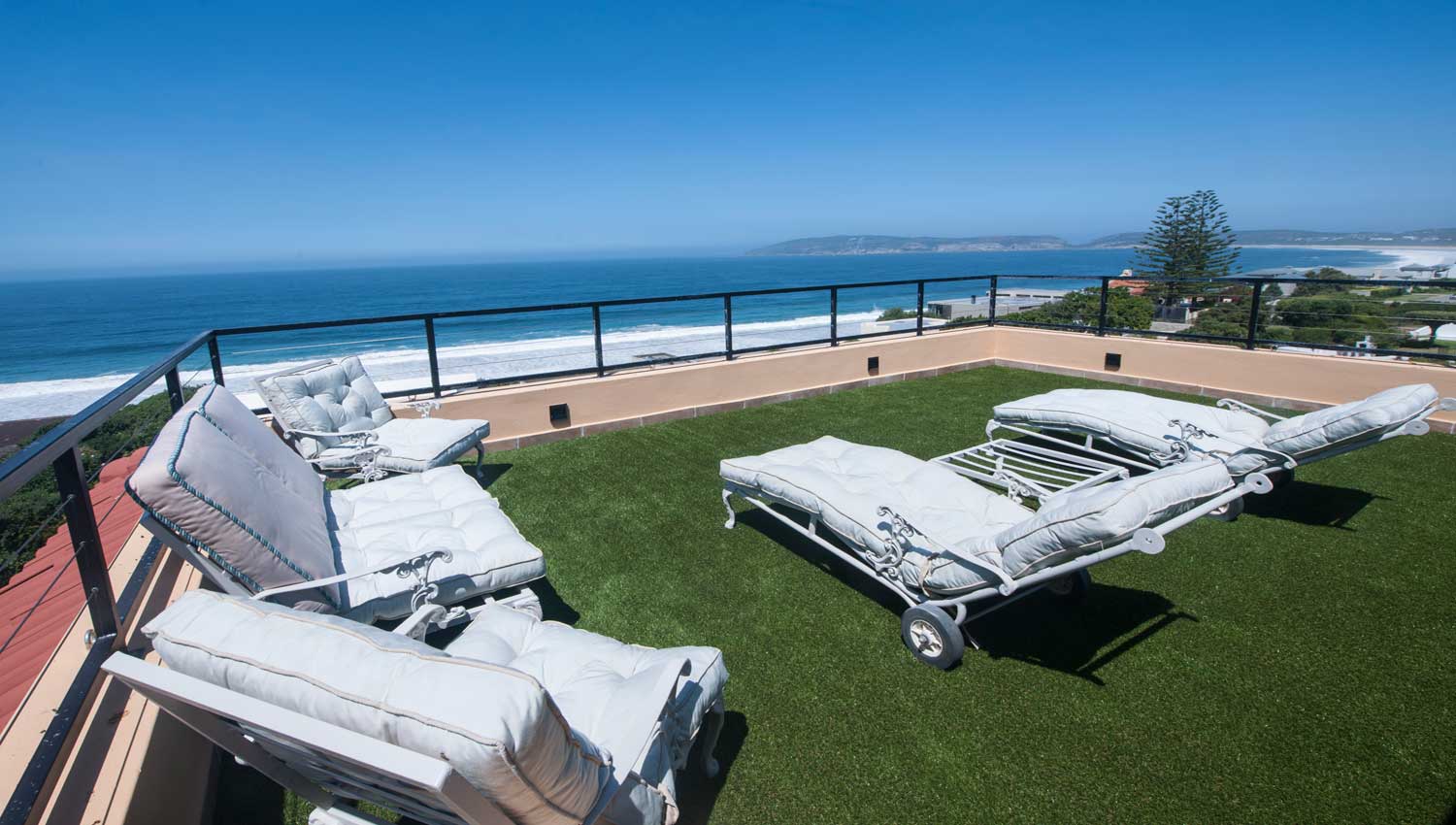 Flowing living/reception areas are located on two floors. The extensive upstairs terrace houses a large Jacuzzi. There is a lawn lookout deck at the top of the house which provides breathtaking 360° vistas of the whole bay area and the surrounding Outeniqua Mountains. 13 Beachy Head Drive is a self-catering establishment with a beautiful kitchen which has a food lift to the top outdoor lookout terrace, a garden at the rear of the house and a separate laundry/utility room. Dining is indoors and outdoors with two outdoor options on the windward and leeward sides of the house. A gas barbeque/braai is provided.